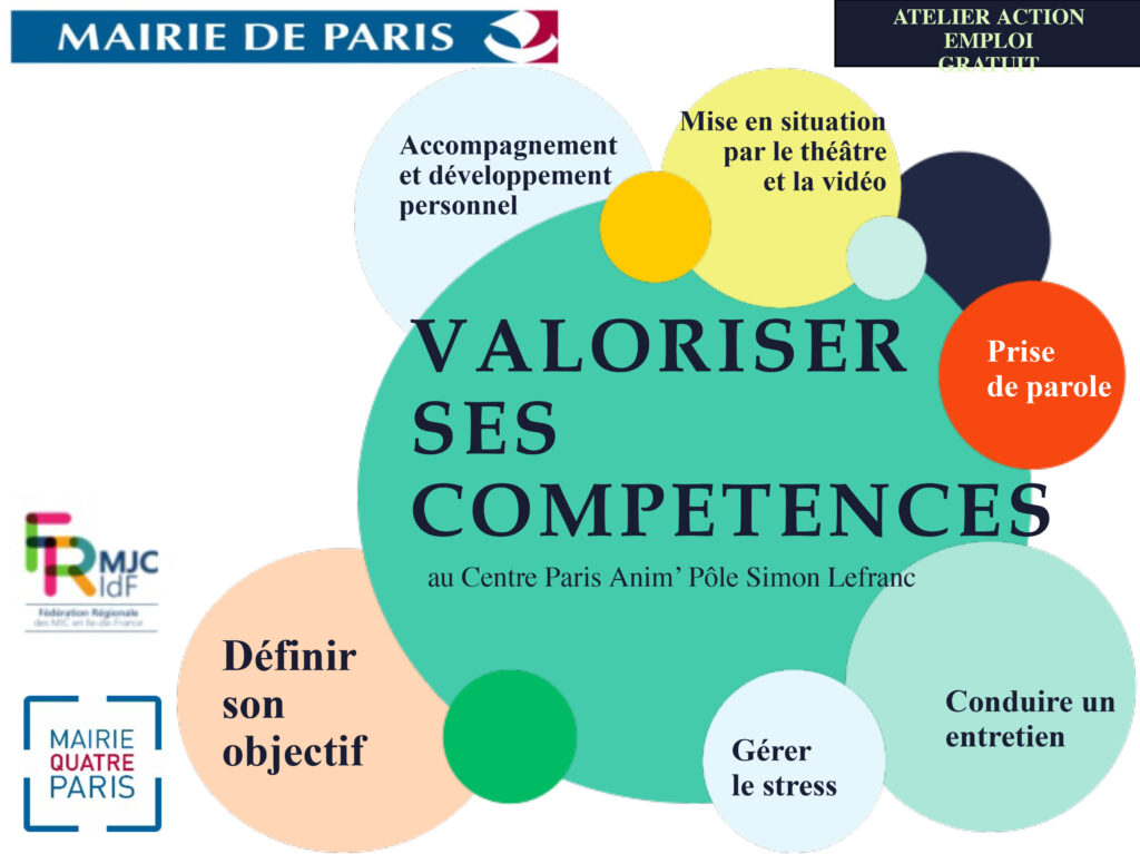 Créatrice et animatrice de cet atelier qui a pour objectif de permettre aux participants de se remotiver et d’apprendre à valoriser leurs compétences. Cela prépare par le biais d’outils d’introspection et d’outils artistiques comme la vidéo et le théâtre, à la gestion du stress, la prise de parole et aux entretiens.
