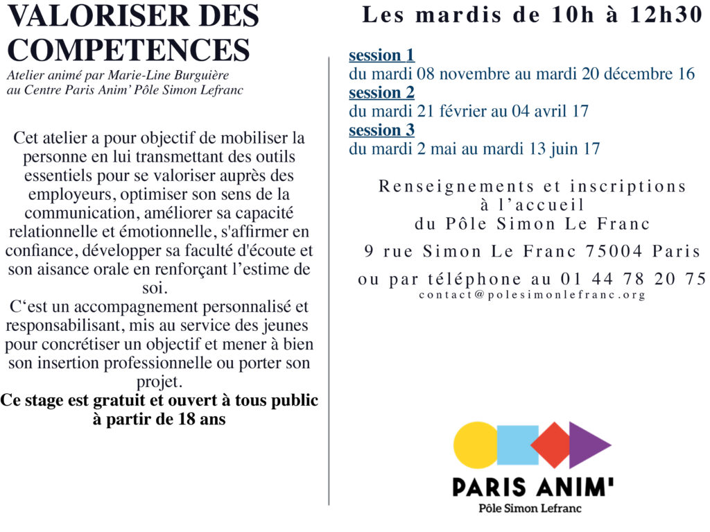 Les prochaines sessions ont lieu au Centre Paris Anim’ Pôle Simon Le Franc les mardis de 10h à 13h au 9 rue Simon Le Franc 75004 PARIS